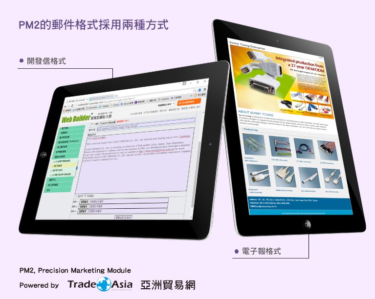 當您的官網採用 eDM 電子報系統時,不僅能夠連結官網會員資料庫和國際 B2B 貿易平台 TradeAsia 亞洲貿易網買家媒合資料庫,還能夠進行主動式的精準行銷。這樣做可以讓您的創新產品、企業品牌和最新活動定期發送到買家的信箱中,長期觸及買家並留下深刻的印象。同時,這種方式還可以實現資料庫精準行銷,建立和長期維護買家關係,獨享潛在商機開發成果。