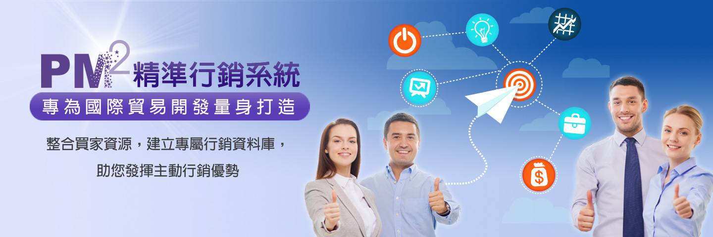 PM2 彈指之間精準行銷,目前已經與國際著名貿易平台 TradeAsia 媒合系統結合,並連上 TradeAsia 買家詢價及買家資料庫,我們將系統與資料串連起來,成為一個強大的商品服務,幫助客戶享受網路科技高效益的水準。客戶使用 PM2 除了可享受買家資料庫的利益外,也可以自建會員資料庫從事品牌行銷、客戶關係管理及產品推廣。從客戶實務經驗反應,長期透過 eDM 維護客戶關係保持品牌熱度,對於企業新產品上市的成功有極大的幫助。